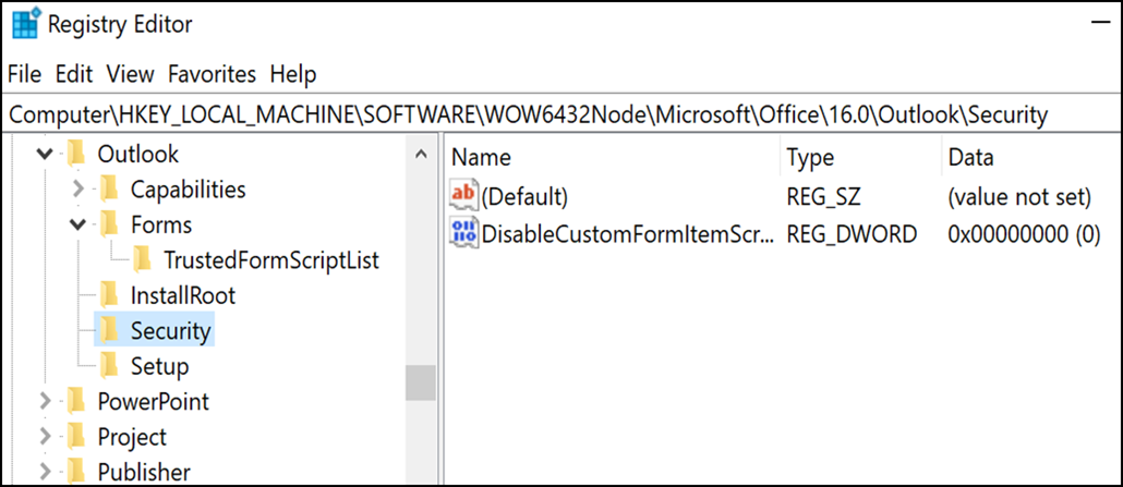 [HKEY_LOCAL_MACHINE\SOFTWARE\WOW6432Node\Microsoft\Office\16.0\Outlook\Forms\TrustedFormScriptList]