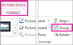 • To group pictures, on the Picture Tools Format tab, click Group > Group.