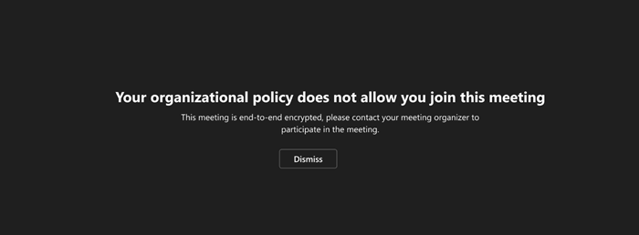 Security policies for the meeting are preventing you from joining:Â If a meeting organizer enables end-to-end encryption for a meeting, you might have limited access to join. Try reaching out to the organizer to be let in