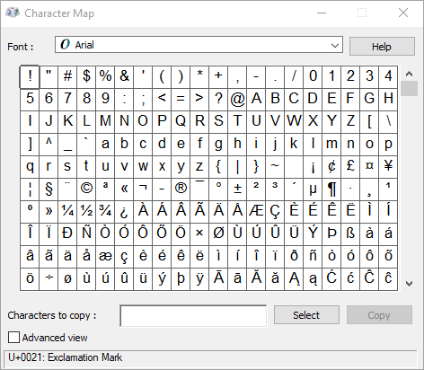 For more character symbols, see the Character Map installed on your computer, ASCII character codes, or Unicode character code charts by script.