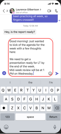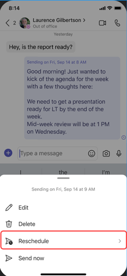 When you'd like to send a message in chat but the timing isn't quite right, schedule the message for a date and time that respects collaboration across locations and working hours. Scheduling the chat message will ensure it's sent at a date and time that you control.