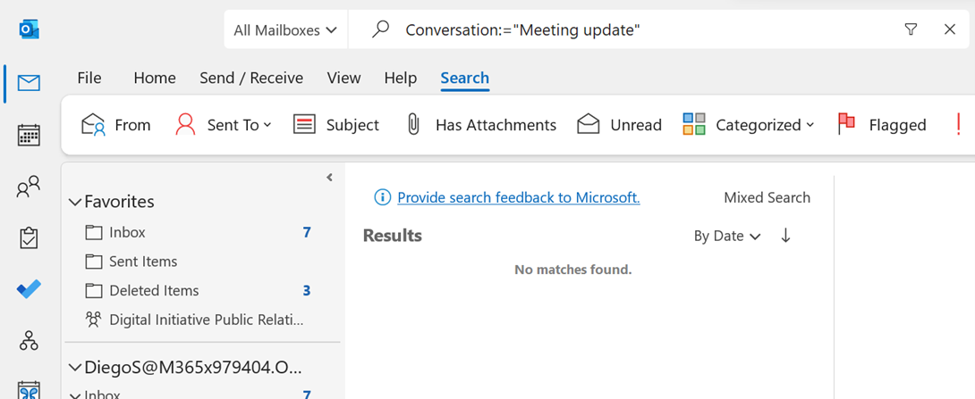 When you search in Outlook Desktop by right clicking on a message and selecting Find Related> Messages in this Conversation, the results are incomplete or missing. This issue occurs due to an incorrectly constructed search string when the Windows and Offline languages are mismatched.