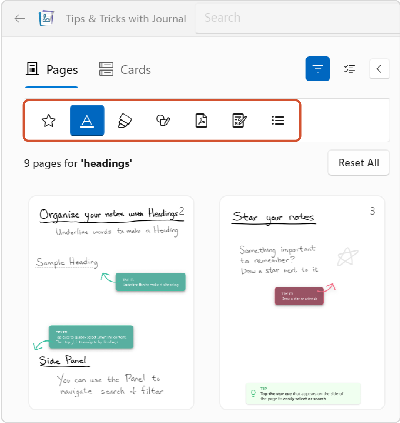 The Search Panel on the top of Microsoft Journal provides a powerful Search experience. You can add a filter to refine your content search, with or without a keyword.